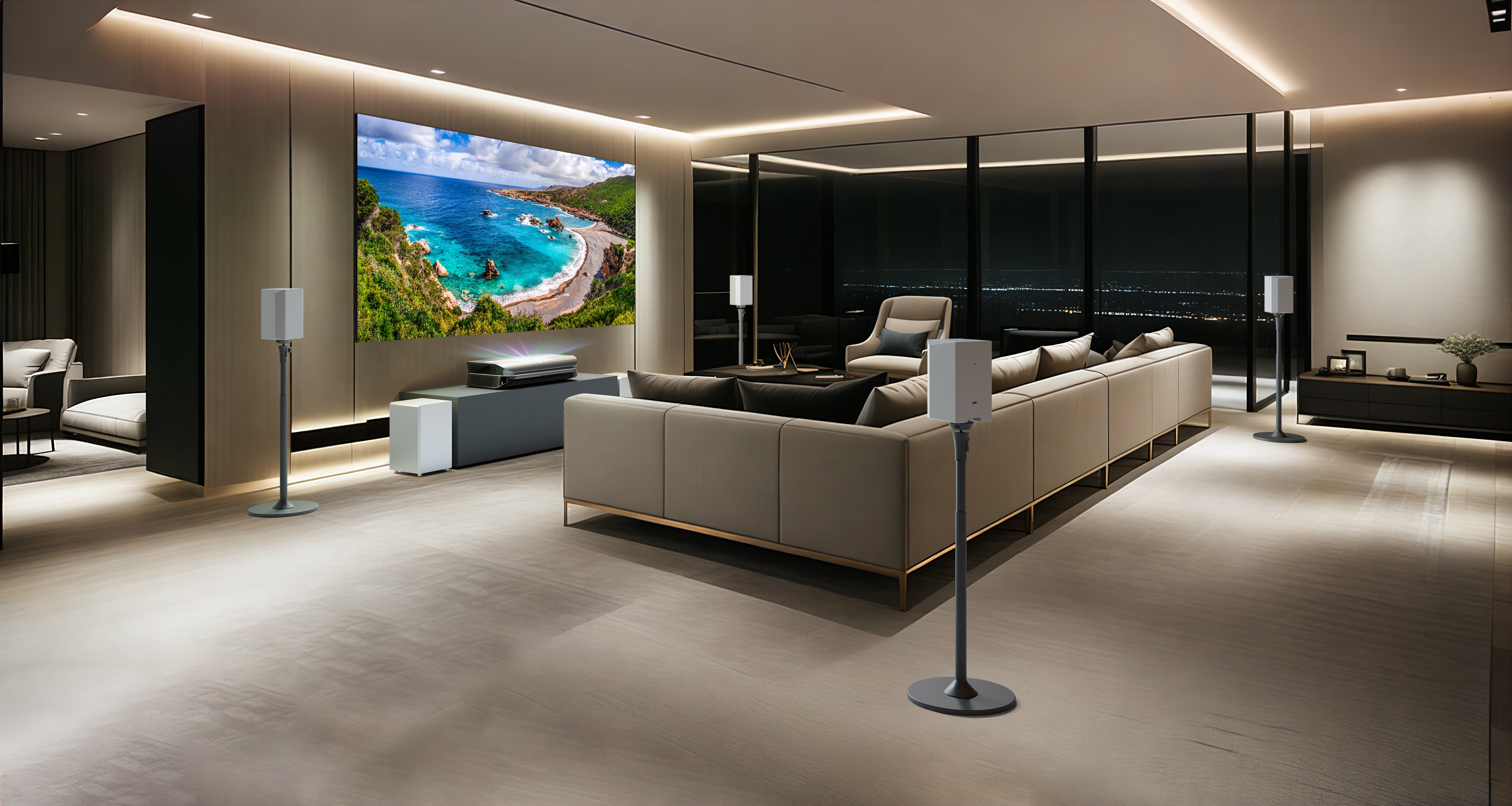 Experience the No.1 UST RGB Laser Projector in the USA, delivering stunning visuals with unmatched brightness and clarity. Paired with our premium ALR screens for sharp contrast, and the newly released ThunderBeat 4.2.2 system, your home theater is taken to the next level. Featuring the innovative CenterSync, the UST projector doubles as a center channel speaker, creating a powerful 5.2.2 surround sound system. Together, this setup offers the ultimate in-home cinema, with breathtaking visuals and immersive sound.